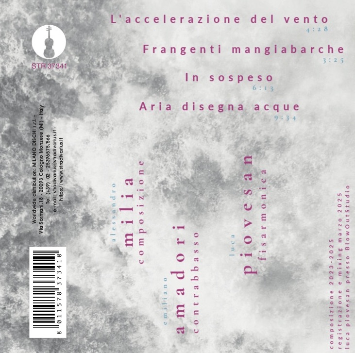 Il nuovo progetto discografico immaginato da Milia, Amadori e Piovesan, registrato a marzo del 2025 esce in EP per l’etichetta Stradivarius. Sulki | quattro momenti del vento è un ciclo in quattro brani che raccontano l’essere umano in relazione a un ambiente fisico dinamico. Composto tra il 2023 e il 2025 per fisarmonica e contrabbasso, indaga, e restituisce in forma sonora, la percezione del sé che muta mentre l’individuo abita un paesaggio che è conseguenza del dinamismo di elementi diversi come l’acqua e l’aria. L’impulso creativo proviene da una stretta collaborazione tra i musicisti Emiliano Amadori al contrabbasso e Luca Piovesan alla fisarmonica che insieme al compositore Alessandro Milia si costituiscono come un gruppo di ricerca estetica e sonora. Il fine del progetto non è creare un lavoro per duo scritto da Milia ma proporre una creazione dove intuizione, progettazione, composizione e interpretazione se pur atti individuali scaturiscono da precise convergenze estetiche, procedurali, formali, etiche, effetto di un’energia creatrice direzionale stabilita da confluenze di più intuizioni nel processo dell’inventare il nuovo orizzonte sonoro. I titoli degli episodi esprimono il processo compositivo pur volendo richiamare l’immagine sublimata, e allo stesso tempo “banalizzata”, di un panorama. L’osservazione di un paesaggio marino dal vero durante una navigazione sotto costa, esaltazione del puro desiderio della natura e di fusione in essa, può far emergere l’esperienza della realtà e la trasformazione della cinestesia dell’individuo. I brani non sono descrizioni di immagini e ricordi ma racconto sonoro della propriocezione, dunque nella musica non siamo guidati dagli elementi ma all’interno di essi: L’accelerazione del vento (traccia 1), Frangenti mangiabarche (traccia 2), In sospeso (traccia 3) e infine Aria disegna acque (traccia 4). Questo mette al centro della ricerca estetica il rapporto dell’essere con la natura. Non inteso come osservatore di un mondo naturale immutabile e sublime. Immaginiamo il turista avventuriero che si compiace del magnifico paesaggio che ha scoperto e lo porterà sempre nel suo cuore. Al contrario l’individuo è parte di quel sistema di forze in relazione. Acqua, vento, barca e persona in una metaforica navigazione. Il dinamismo degli elementi si può sentire, subire, amare, alterare ma in un senso più ampio si può anche distruggere; è ciò che l’uomo sta realmente facendo col pianeta che viene idealizzato in 8k ma di cui agevoliamo la fine fisica con la nostra stessa esistenza. Due tendenze formali e altrettante propensioni narrative investono il ciclo di brani. Il primo e il terzo movimento sono forme caratterizzate da un solo e continuo orientamento trasformativo – senza ulteriori processi di contrasto. Mentre il secondo e il quarto sono forme accomunate dalle logiche del frammentario e del discontinuo – procedono per digressioni e per ritorni temporali del materiale. Nel piano formale globale del lavoro questa alternanza di forma trasformativa unica e forma digressiva a più materiali è fortemente caratterizzante e rende distintivi i processi compositivi. Se dovessimo usare la metafora dell’aria, o del vento, i movimenti dispari, tracce 1 e 3, sono dei flussi costanti, più intelligibili e ordinati, mentre i movimenti pari, tracce 2 e 4, esprimono condizioni cangianti, un vento rafficato, imprevedibile e che cambia direzione continuamente togliendo la possibilità di fare previsioni. Sulki è una parola antica, suona semplicemente come solco, traccia, rotta. Antica città fenicia fondata in una zona sud-occidentale della Sardegna caratterizzata da arcipelaghi di scogli affioranti, isole, isolotti, fari, da coste selvagge, e da terre bucate oggi da gallerie minerarie. l potenti venti dominanti sono il maestrale da nord-ovest e il libeccio da sud-ovest che formano il paesaggio e ridisegnano ad ogni istante l’acqua con i loro movimenti.